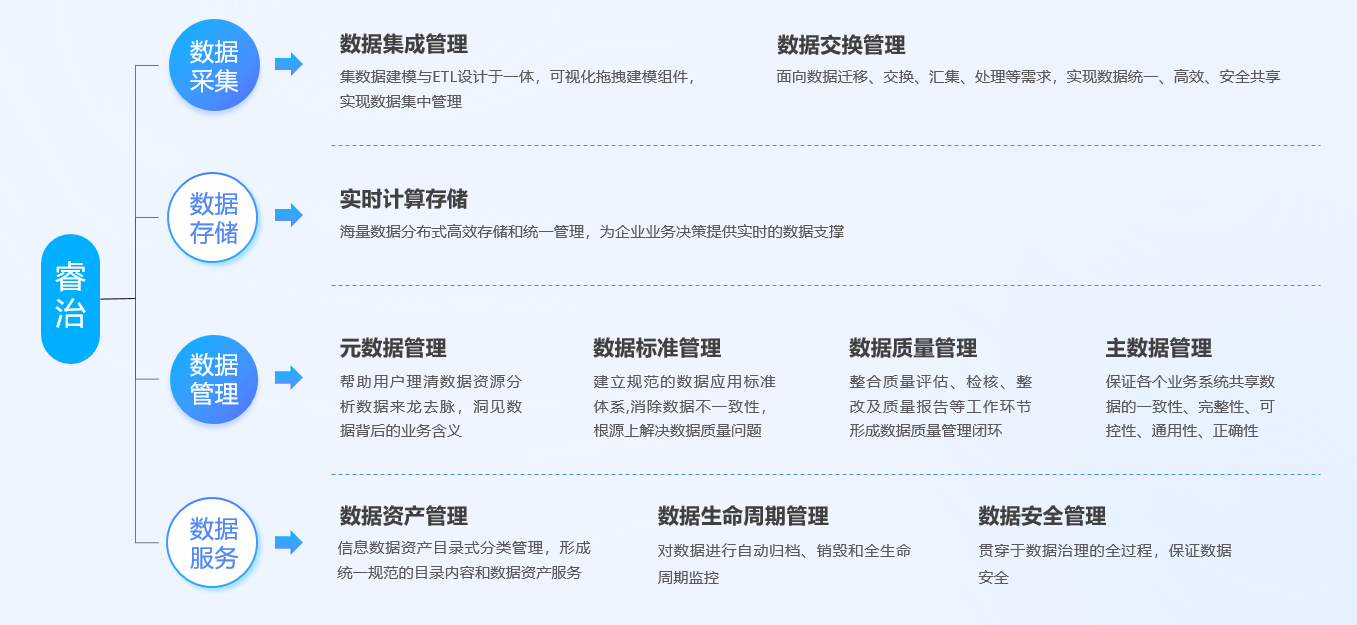 睿治智能数据治理平台并荣获DAMA中国数据治理优秀产品奖、星河奖优秀大数据产品奖等多个重磅奖项,形成包含数据交换、数据集成、主数据、实时数据计算、数据质量、数据标准、元数据、数据集成、数据资产、数据交换、数据安全和数据生命周期十大模块的数据治理产品方案,提升数据质量,助力数据标准落地,实现数据资产化。