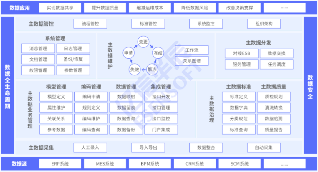 1、构建企业黄金数据。实现主数据全生命周期管理,实现各类主数据的集中管理和统一分发。