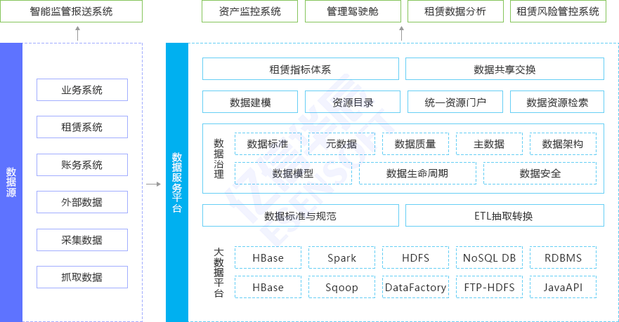租赁企业立足当今大数据高信息化开展时代,唯有全面管控数据资产,从监管报送、数据存储、数据模型、数据治理到数据应用,实现覆盖租赁全行业范围的全生命周期管控。